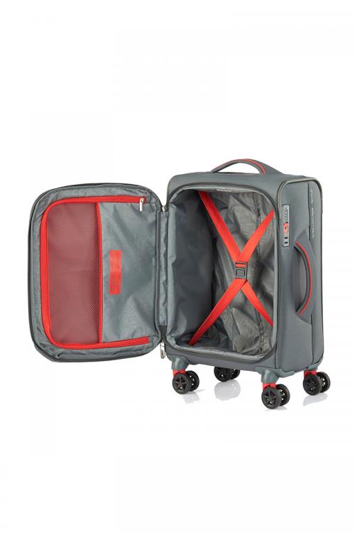 内装には、アクセントカラーがあしらわれた荷崩れを防ぐクロスストラップや、小物などの収納が可能な ファスナー付きのメッシュポケットも備えられています。