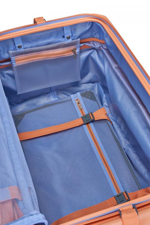 フタを浅く、メイン収納部に厚みをもたせ収納スペースを最大限に確保した独自の設計PlentiVol™により、パッキングのしやすさはもちろん、スペースが限られた場所でもコンパクトに開閉することができます。荷崩れを防ぐクロスストラップが付属し、そのほかに小物などが収納可能なポケットを備えています。