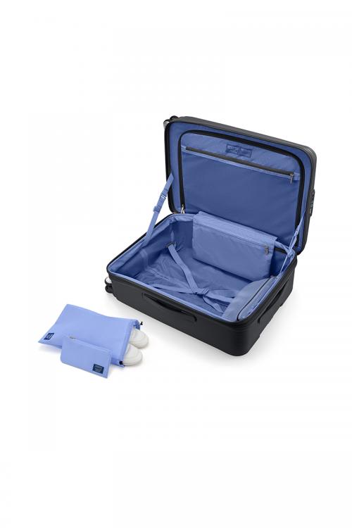 アクセントカラーのロゴに、マットとグロッシーの異なる質感のコンビネーションが表情豊かなトラベルコレクション「MAXIVO(マキシーヴォ)」。 20:80構造のユニークな PlentiVol™パッキングシステムにより、フタ部分を浅く、メイン収納部をたっぷりと確保することで、厚みのある荷物なども楽に収納できる、パッキングのしやすさにこだわったコレクションです。また、旅をより快適にする機能性も充実しており、電車内や不安定な場所 で活躍するホイールストッパーStePause™がそれぞれの前輪に付属 しており、ワンステップで ON/OFFの切り替えを簡単に操作することができます。