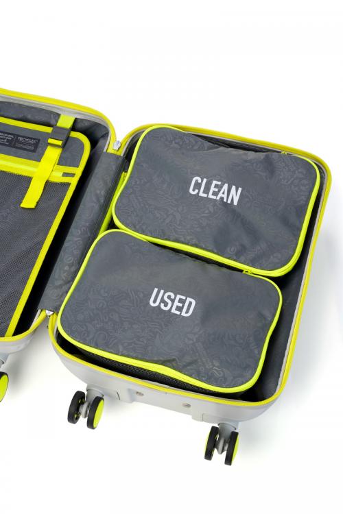 スーツケースとバッグを展開し、スーツケースには“CLEAN”と“USED”と書かれた半円状のユニークなパッキングキューブが2つ付属しており、衣類を分けて収納することができます。  また、内装には荷崩れ防止のディバイダ―とクロスストラップや、ポケット類などの収納をサポートする機能を各所に搭載しています。