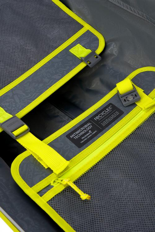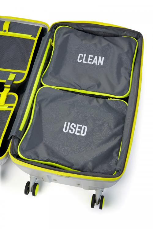 スーツケースとバッグを展開し、スーツケースには“CLEAN”と“USED”と書かれた半円状のユニークなパッキングキューブが2つ付属しており、衣類を分けて収納することができます。  また、内装には荷崩れ防止のディバイダ―とクロスストラップや、ポケット類などの収納をサポートする機能を各所に搭載しています。