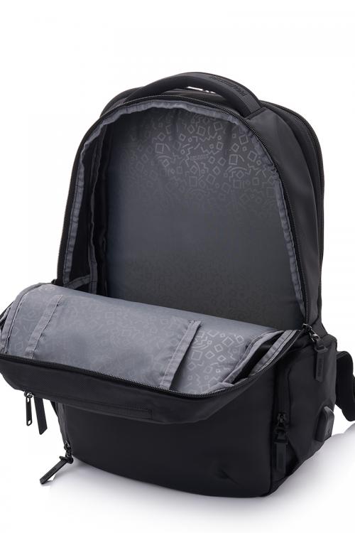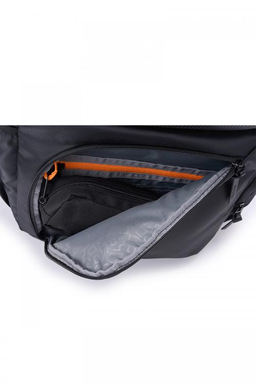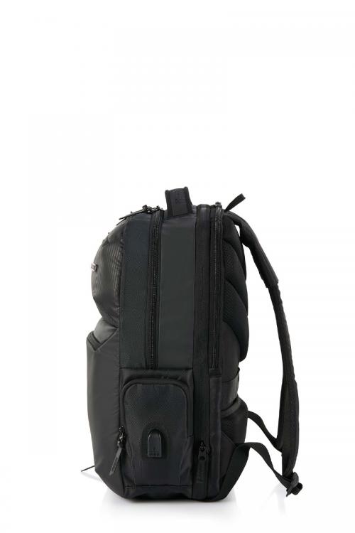 17インチまでのPCを収納可能なビジネスバッグ。フロントポケット内にはペンやカードケースを整理して収納可能なポケットがついているほか、取り外し可能なポーチを備えています。サイドにはUSBポートがあり、バックパックを背負ったまま充電することも可能です。