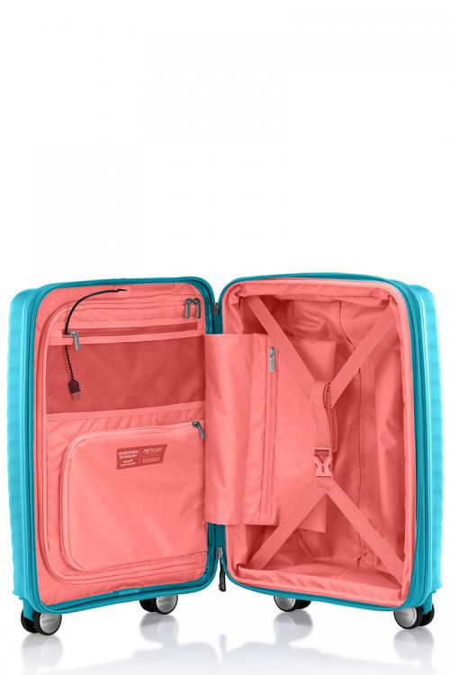 機内持ち込みサイズのスピナー55 には、手持ちのモバイルバッテリーを内装にセットすることで、どこでも充電することが可能なUSBポートがスーツケースの上部に付属しています。