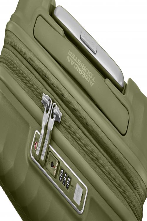機内持ち込みサイズのスピナー55 には、手持ちのモバイルバッテリーを内装にセットすることで、どこでも充電することが可能なUSBポートがスーツケースの上部に付属しています。